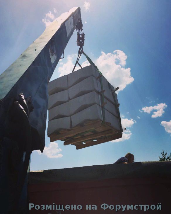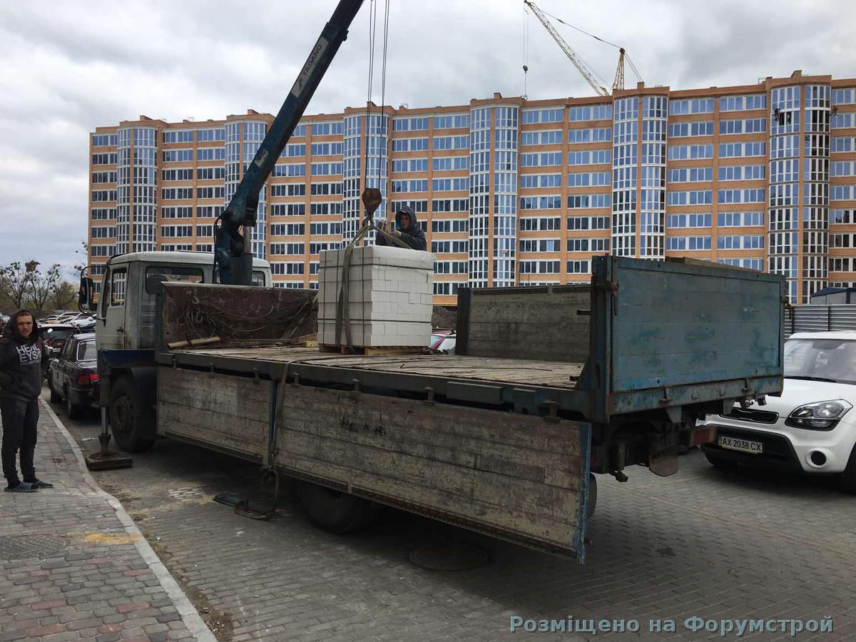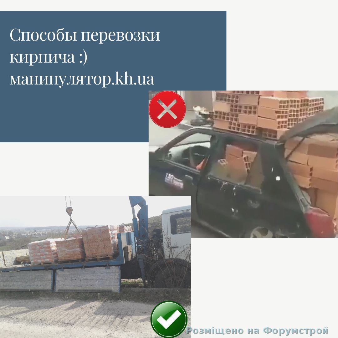 Доставка кирпича в Харькове при помощи крана манипулятора.