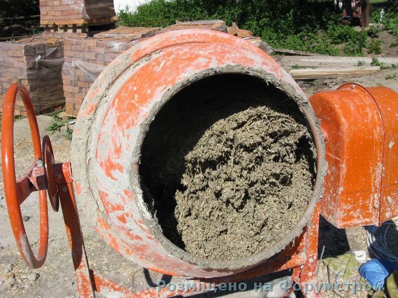 Костра в мешках, костробетон в бетономешалке и, собственно, пирог стены.