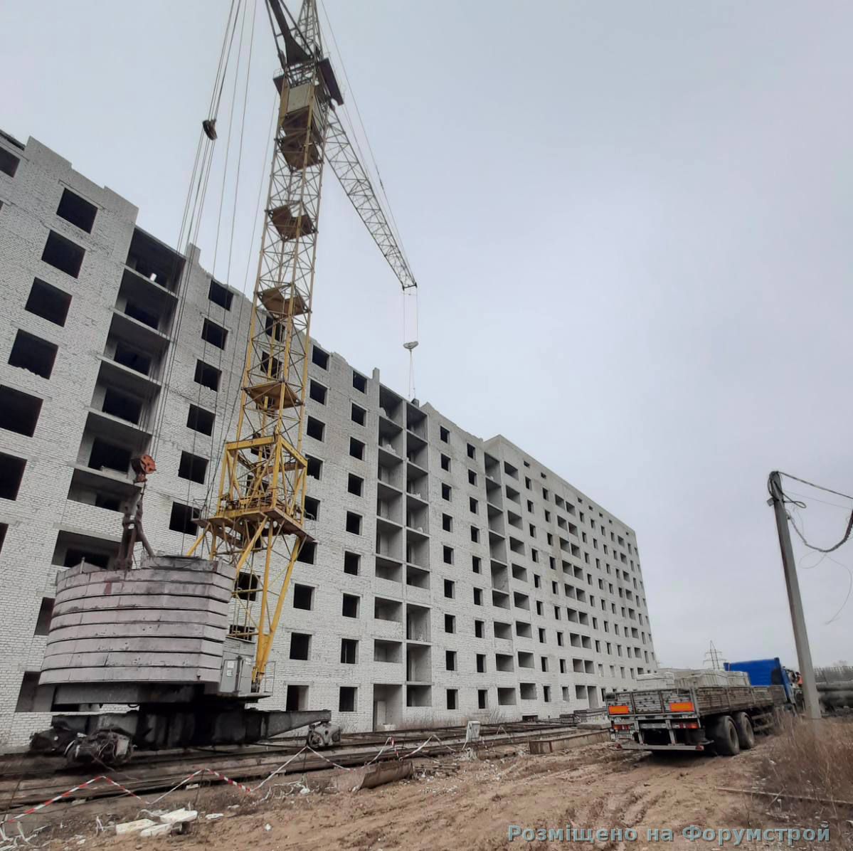 Жилой дом 25 на ул. Полтавский шлях, 186. Строители закончили кирпичную кладку и монтируют лифтовое оборудование.
